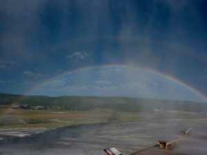I relive my joy of seeing the awesome power of Beehive Geyser’s enormous firehose-like eruption, the beautiful rainbow appearing as it rains down on everyone.
