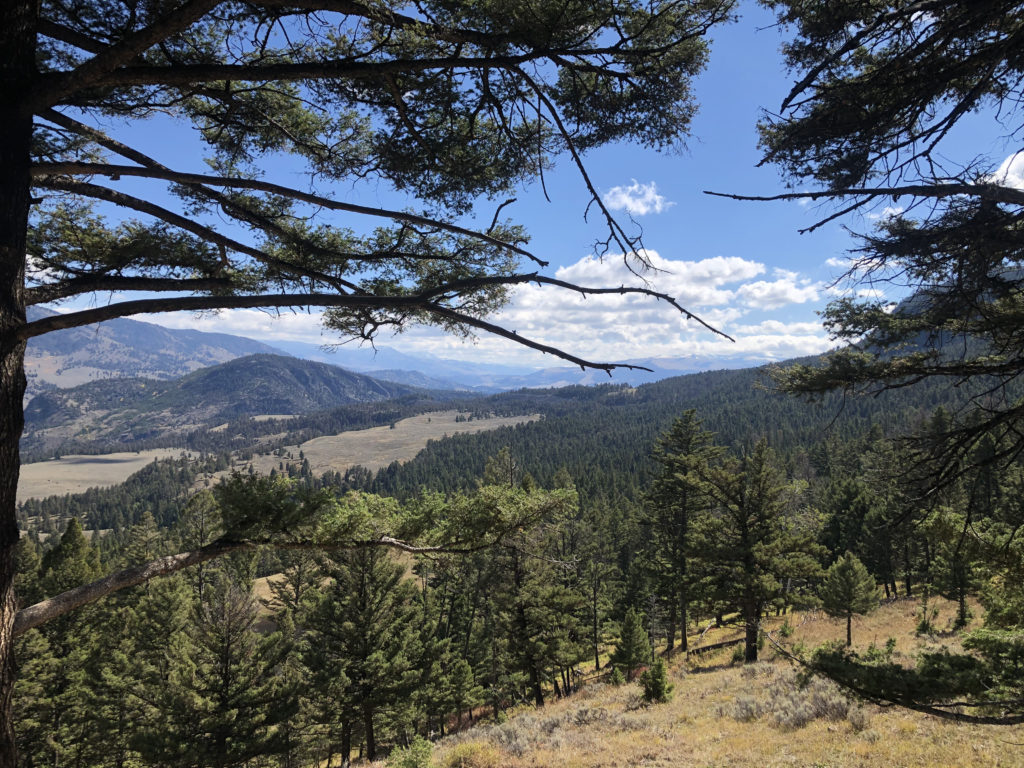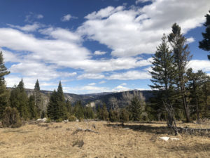 This is a photo of a Douglas fir tree (actually an evergreen conifer species in the pine family) growing out from under a huge boulder. Well, it’s actually the roots of the tree that are under the boulder. These are glacial erratics (left on the landscape when glaciers receded) and there are lots of them in the Northern Range of Yellowstone. In this area the Douglas fir trees are on the edge of their ability to reproduce and the erratics provide enough of an environmental modification for them to grow. These erratics provide a young seedling with shade, moisture, shelter from wind, and they absorb and radiate heat which melts the surrounding snow faster. Douglas fir seedlings prefer to grow initially in shade and if a seed which is carried by the wind falls near a protective rock, it has a better chance of germination than if it were out in the open, more harsh environment.