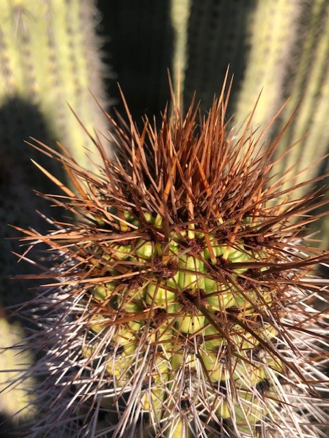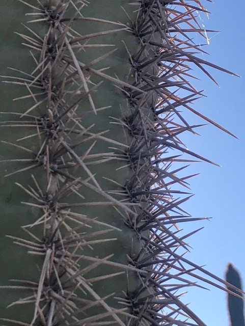 They protect the cactus from the harsh desert heat and sun. They help to cool the plant. They scatter—or radiate—and diffuse heat off the cactus. In the lower trunk they’ll often lose the spines and a dark cork-like bark appears.
