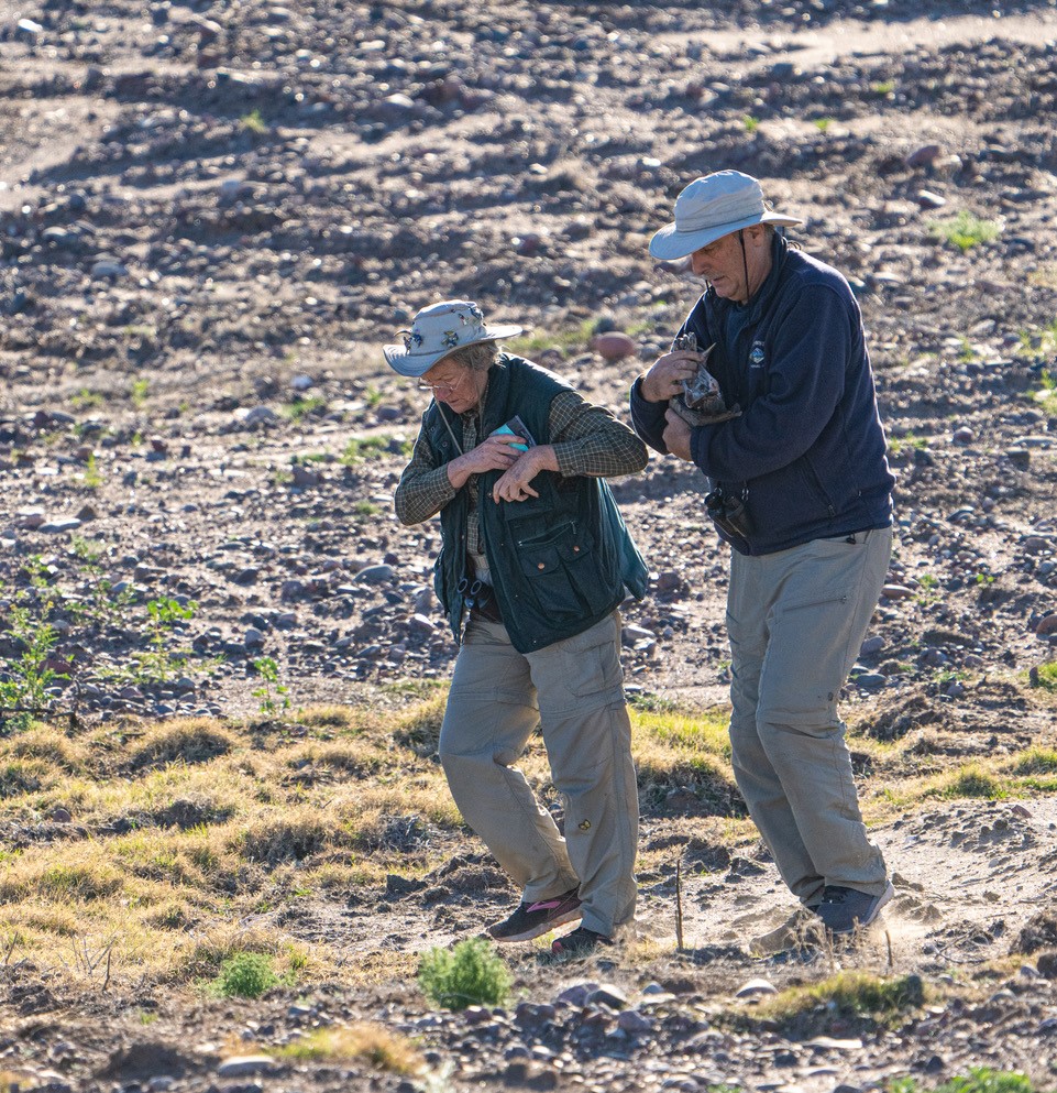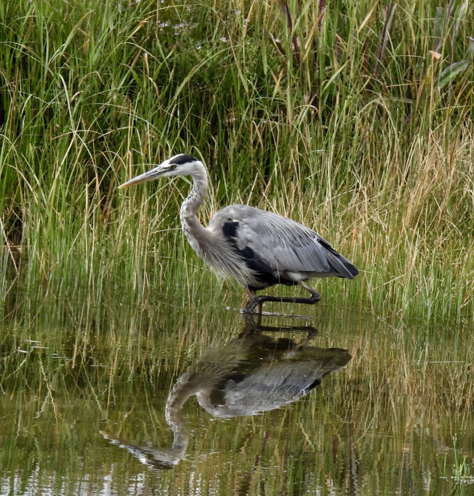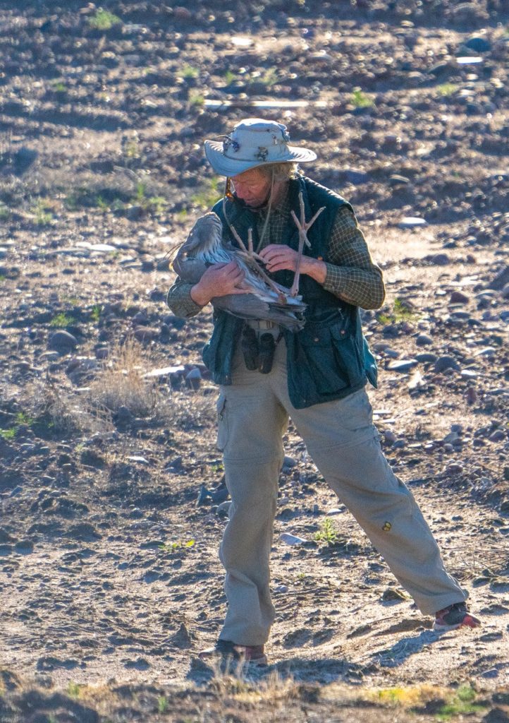 We were on our usual morning walk recently along the Salt River near Tempe Town Lake here in Arizona. While heading west, we said “Hello” to the usual group of photographers. I noticed an adult Bald Eagle and a Kestrel on the light poles. But that wasn’t the direction in which the photographers were looking. They were definitely looking toward the big field that used to be the ASU Golf Course. That’s when I noticed it. Over in the field—not at the river—those flapping huge big bluish-gray wings. Not in the air. On the ground. My partner Steve and I kept looking with our binoculars. We kept looking and would notice the flapping again. Then it would stop, flopping on the ground. What was that? Then we saw it again. Something was definitely wrong over there. It was a large bird and it was in some kind of trouble. What was going on?