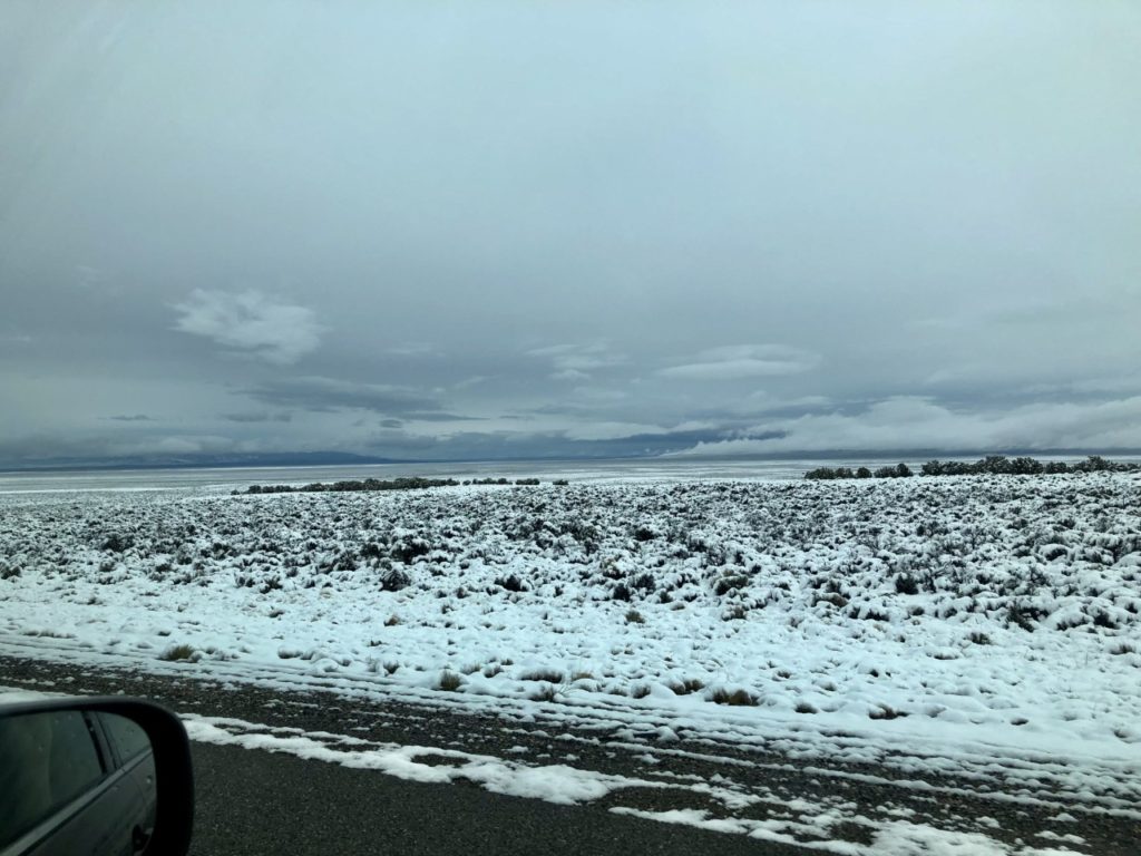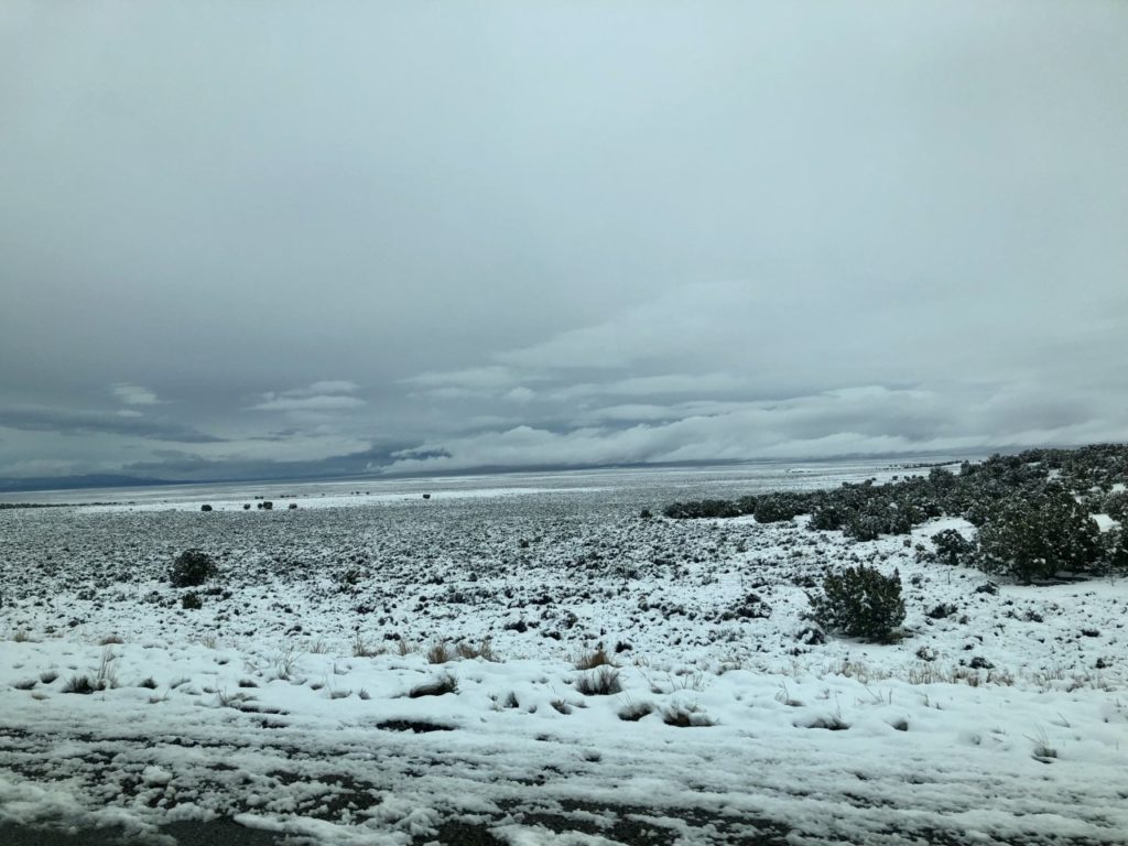 It was snowing when we left Ely, but we were at about 6600 feet and figured we’d have rain as we headed to lower elevations. No rain but certainly a beautiful drive–and no wind. Really serene and, as we got to lower elevations, we could see the mountains.